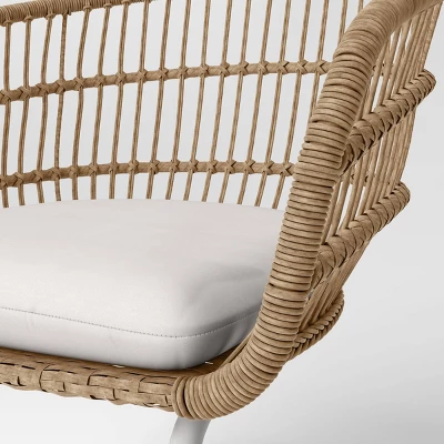 Chat over coffee with a friend with the Southport 3-Piece Motion Chat Set from Opalhouse™. This lovely patio furniture set comes with two armchairs with seat cushions and one accent table. The set perfectly accommodates two people and is great for entertaining guests or spending time with family. The pieces feature a white steel frame with beige wicker details that make for a chic and bold aesthetic. These classic colors match easily with any design themes you prefer. Pair with bright and bold colors for a playful space or with neutral colors for a space that is sleek, modern and calming. The rust-, water- and weather-resistant properties mean you can enjoy your outdoor space without worrying about maintenance.